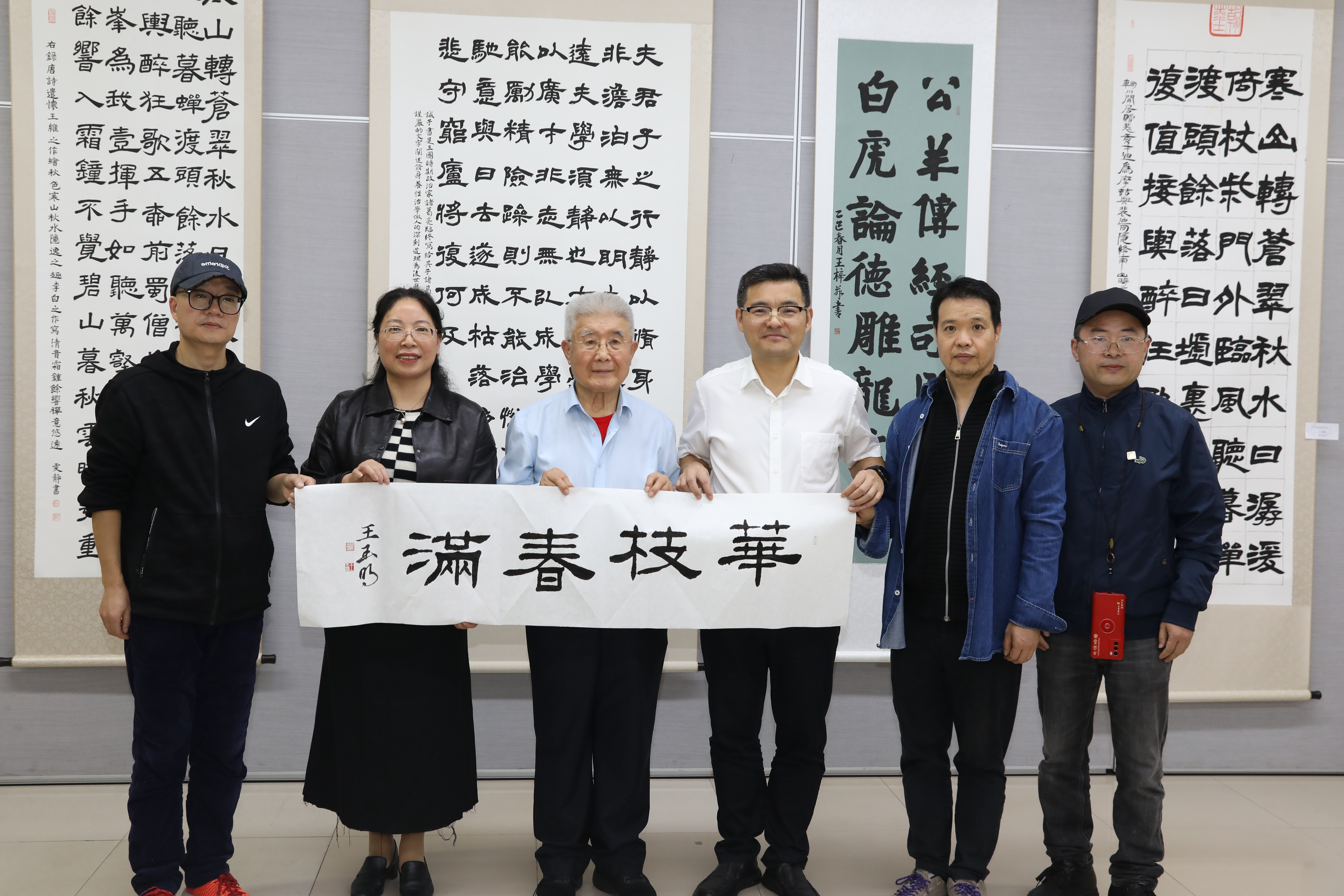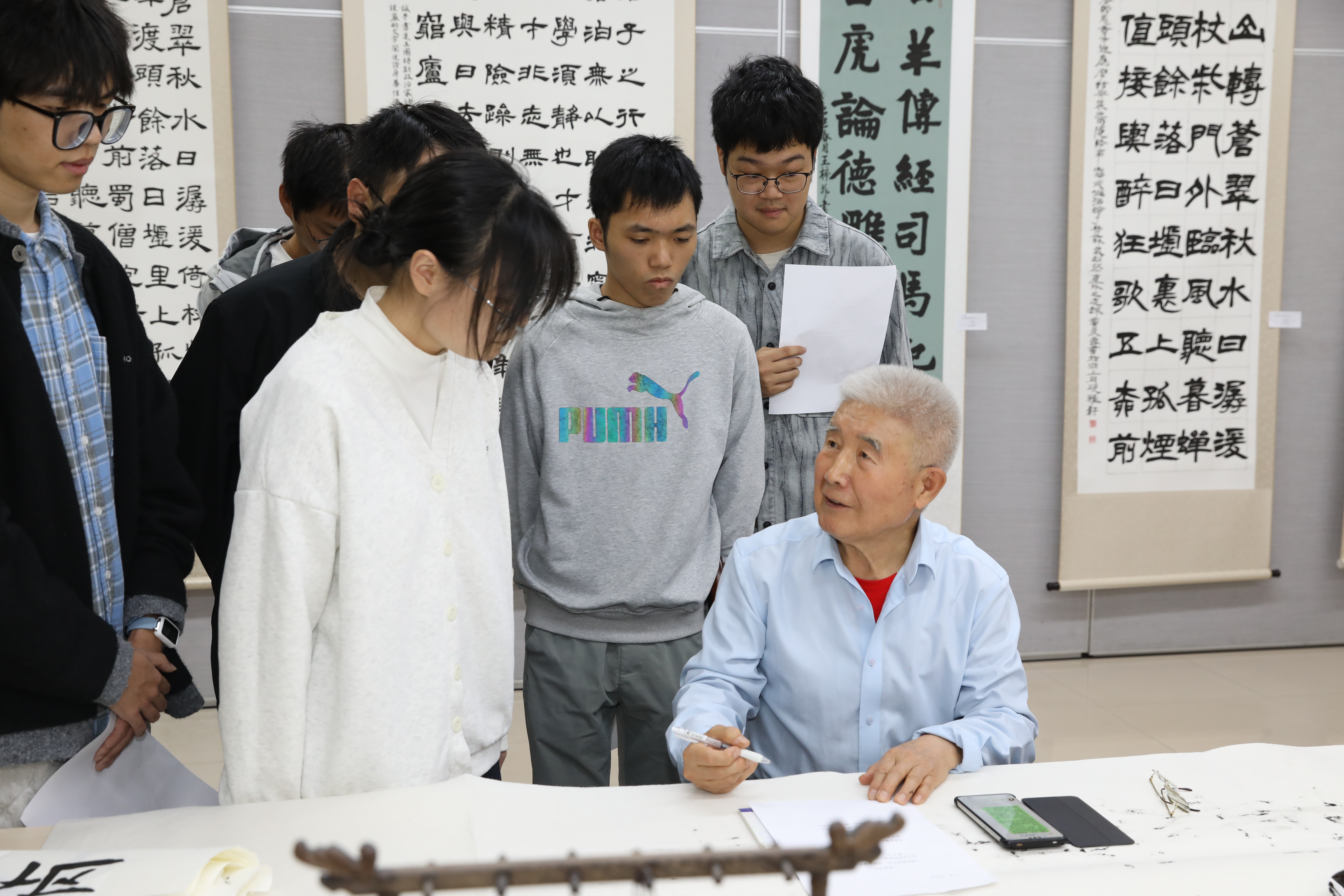 85岁高龄的王玉明院士飞抵杭州后,未作片刻休整便奔赴校园。观展间隙,应师生之请题写展名“华枝春满”,王院士以隶书创作,三易其稿的执着身影,将治学匠心展现得淋漓尽致。首遍落笔后,王院士细审之下觉“华”字隶书规范略有欠缺,当即在工作人员协助下查阅书法字典校准字形;第二遍书写已成佳作,围观师生纷纷驻足称赞,他却仍对“春”字的笔画细节不甚满意,坚持重新铺纸书写;直至第三遍,王院士凝神聚力、笔酣墨饱,终成令自己满意的作品,落笔瞬间全场响起热烈掌声。